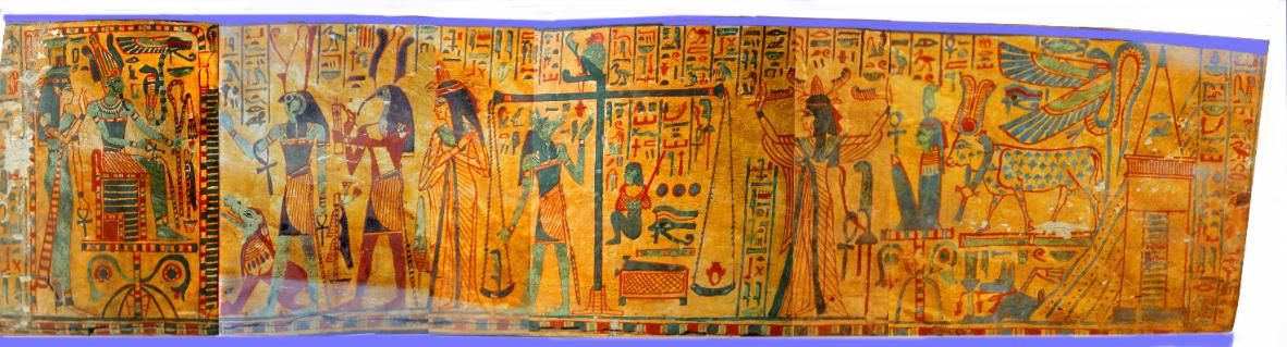 inner coffin tub, the standard place (right or left) for the Hathor Cow emerging from the West Mountain, showing tomb, Anubis and the goddess Neith as a